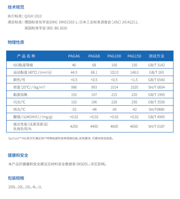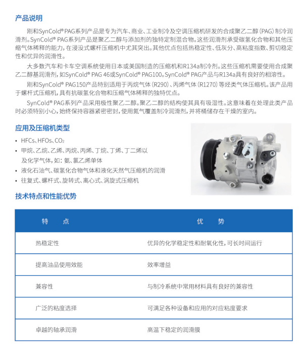 ■ ■ ■剛和SynCold?PAG系列產(chǎn)品是專為汽車、商業(yè)、工業(yè)制冷及空調(diào)壓縮機研發(fā)的合成聚乙二醇(PAG)制冷潤滑劑。SynCold?PAG系列產(chǎn)品是聚乙二醇與添加劑的獨特定制混合物。這些潤滑劑承受碳氫化合物和其他壓縮氣體稀釋的能力,在浸沒式螺桿壓縮機中尤其突出。其他優(yōu)點包括熱穩(wěn)定性、低灰分、高粘度指數(shù)、剪切穩(wěn)定性和優(yōu)異的潤滑性。